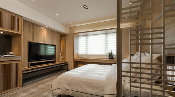 讓窗景在眼眸間流動,映照出最寫實的生活畫面。這是欣磐石建筑室內(nèi)設(shè)計對于住宅設(shè)計的最強理念。 想讓居室擁有最大視野,設(shè)計師羅仕哲在整體設(shè)計上采用凈空手法處理。因此,電視主墻以窗取代,透過風(fēng)琴簾的自由切換