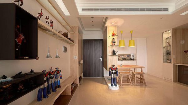 以北歐風(fēng)格的生活質(zhì)感為基礎(chǔ),挹注大量木質(zhì)紋理的溫暖,搭配上明亮色彩的燈飾、沙發(fā)點綴,簡約又不失活力與朝氣。而為了能展示屋主多年收藏的玩具、公仔,設(shè)計師也在各空間中打造醒目的開放式平臺,讓居住者喜愛的事
