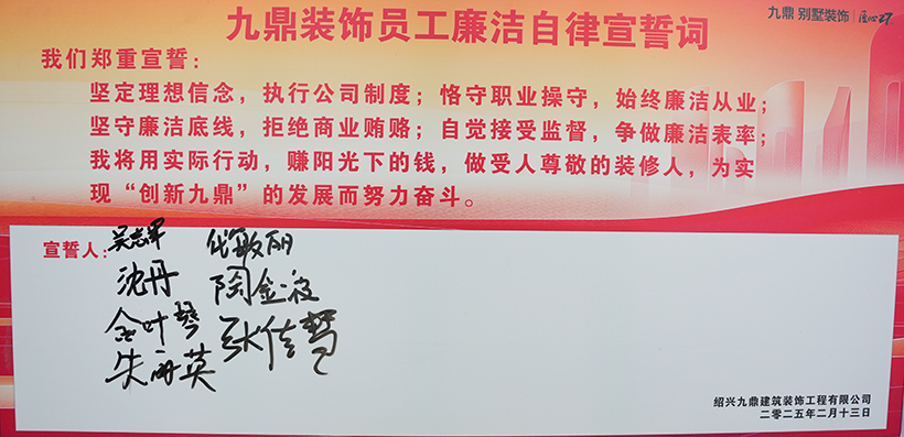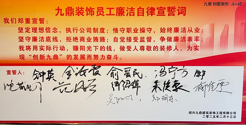 2025年2月13日——為積極響應(yīng)國(guó)家關(guān)于加強(qiáng)企業(yè)合規(guī)建設(shè)的號(hào)召,進(jìn)一步規(guī)范行業(yè)經(jīng)營(yíng)秩序,紹興九鼎裝飾正式發(fā)布《員工廉潔自律》規(guī)范,成為紹興裝飾行業(yè)中系統(tǒng)性推行廉潔自律管理制度的企業(yè)。這一舉措標(biāo)志著九鼎裝飾在內(nèi)部治理、客戶(hù)服務(wù)與行業(yè)責(zé)任領(lǐng)域邁出重要一步,為行業(yè)樹(shù)立了“透明裝修、廉潔從業(yè)”的新標(biāo)桿。
