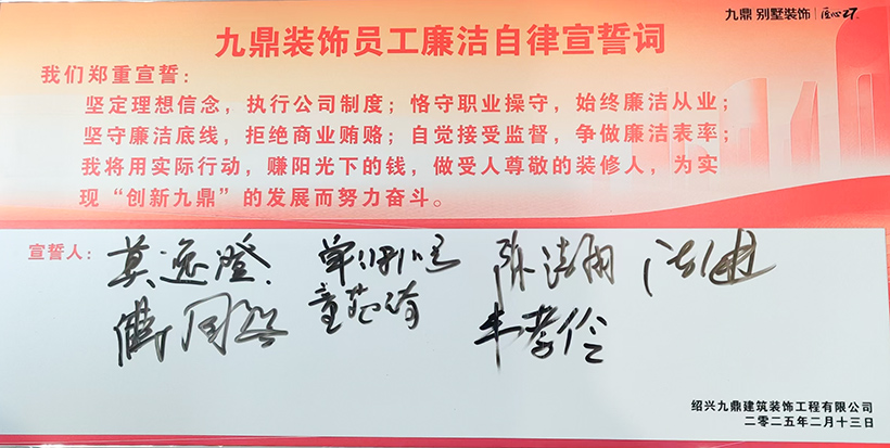 紹興九鼎裝飾總經(jīng)理鐘河北在會(huì)上表示:“誠(chéng)信是企業(yè)的生命線(xiàn)。我們希望通過(guò)制度約束與文化引導(dǎo),讓每一位員工成為廉潔自律的踐行者,讓客戶(hù)真正享受到透明、省心的裝修服務(wù)?!?nbsp;